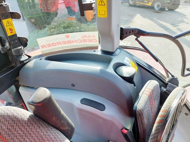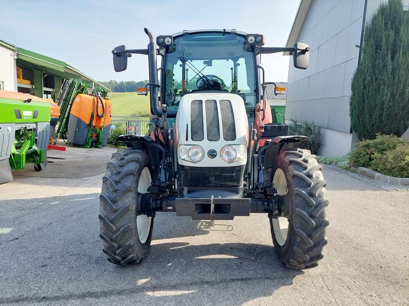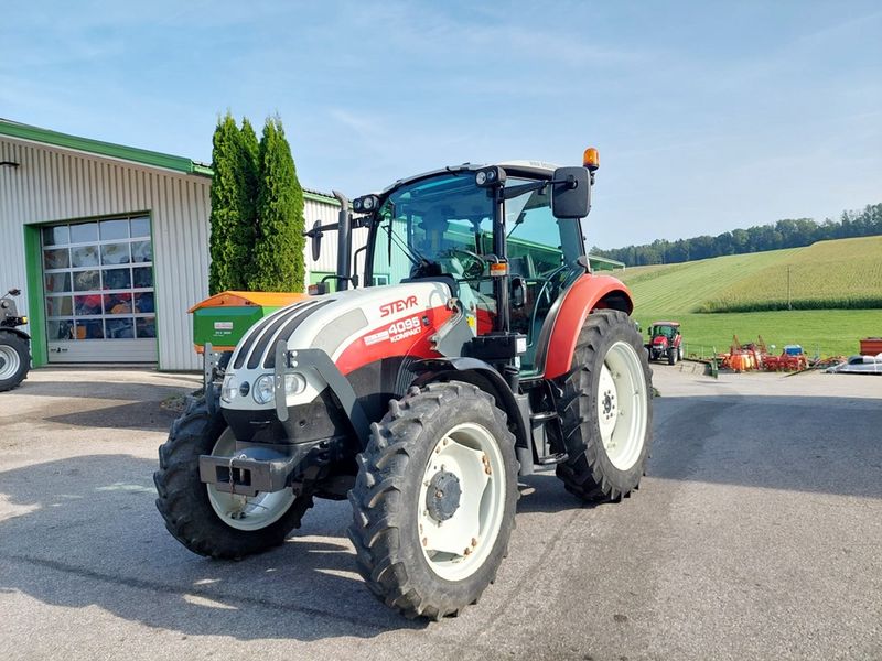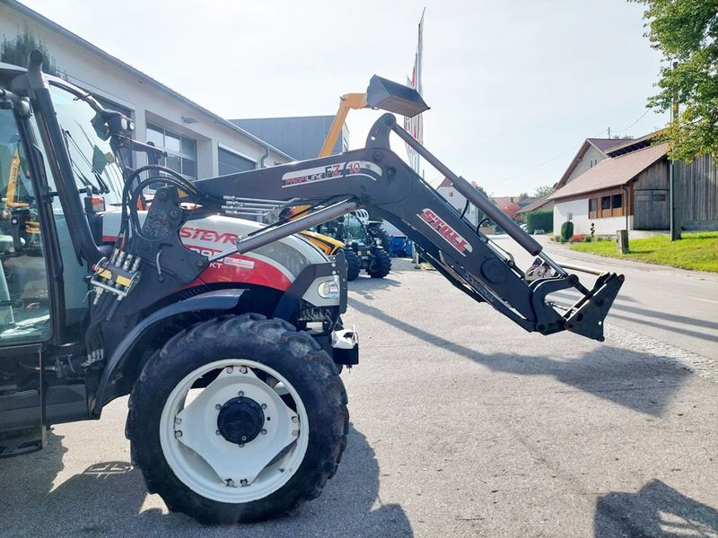 Steyr Kompakt 4095 Allradtraktor (BJ: 2014) ca. 3.115 Bstd. mit 24+24 Gang 40 km/h Lastschaltgetriebe, ZW: 540/540E/1000 U/min, Klimaanlage, EHR, Zusatzhubzylinder, Schnellkuppler, Radio, Drehleuchte, 3 Hecksteuergeräte mech. dw., 1 Mittelachssteuergerät mech. dw., Teleskopspiegel, Bereifung 280/85 R 28 und 340/85 R 38, Stoll Frontlader FZ 10.1 ProfiLine mit Multikuppler und 3. Funktion (DW), ohne Werkzeuge