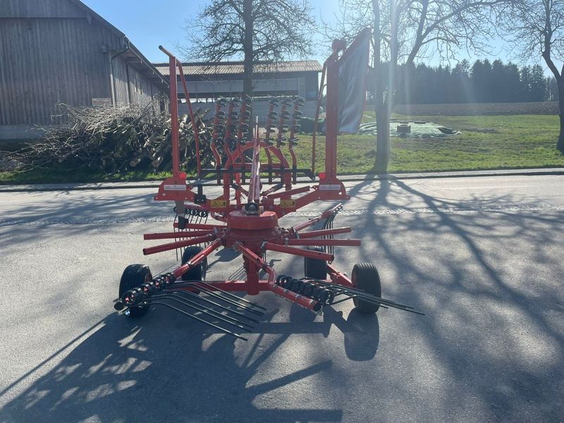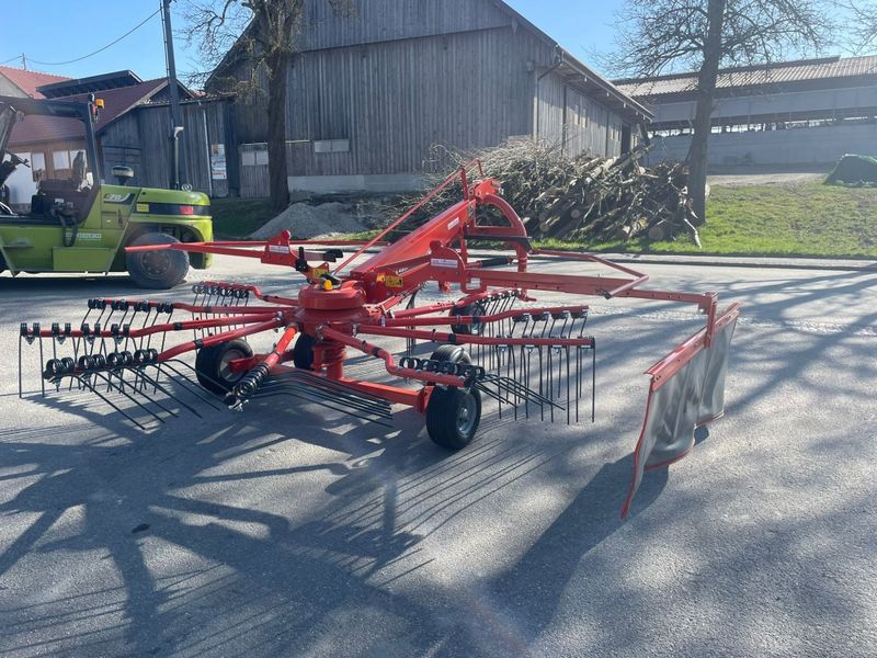 Kuhn GA 4201 Schwader mit 11 Zinkenarmen abnehmbar mit je 4 Doppelzinken, geschlossenes wartungsfreies Fettgetriebe, Zinkenhöhenverstellung über Kurbel, Kreiselbereifung: 16 x 6,50 -8, Dreipunktanbau Kat. 2, Schwenkkopf - Nachlaufeinrichtung, 2 mech. Schwingungsdämpfer am Schwenkkopf, Schwadtuch rechts und Gelenkwelle mit Überlastsicherung; Arbeitsbreite: ca. 4,20 m
